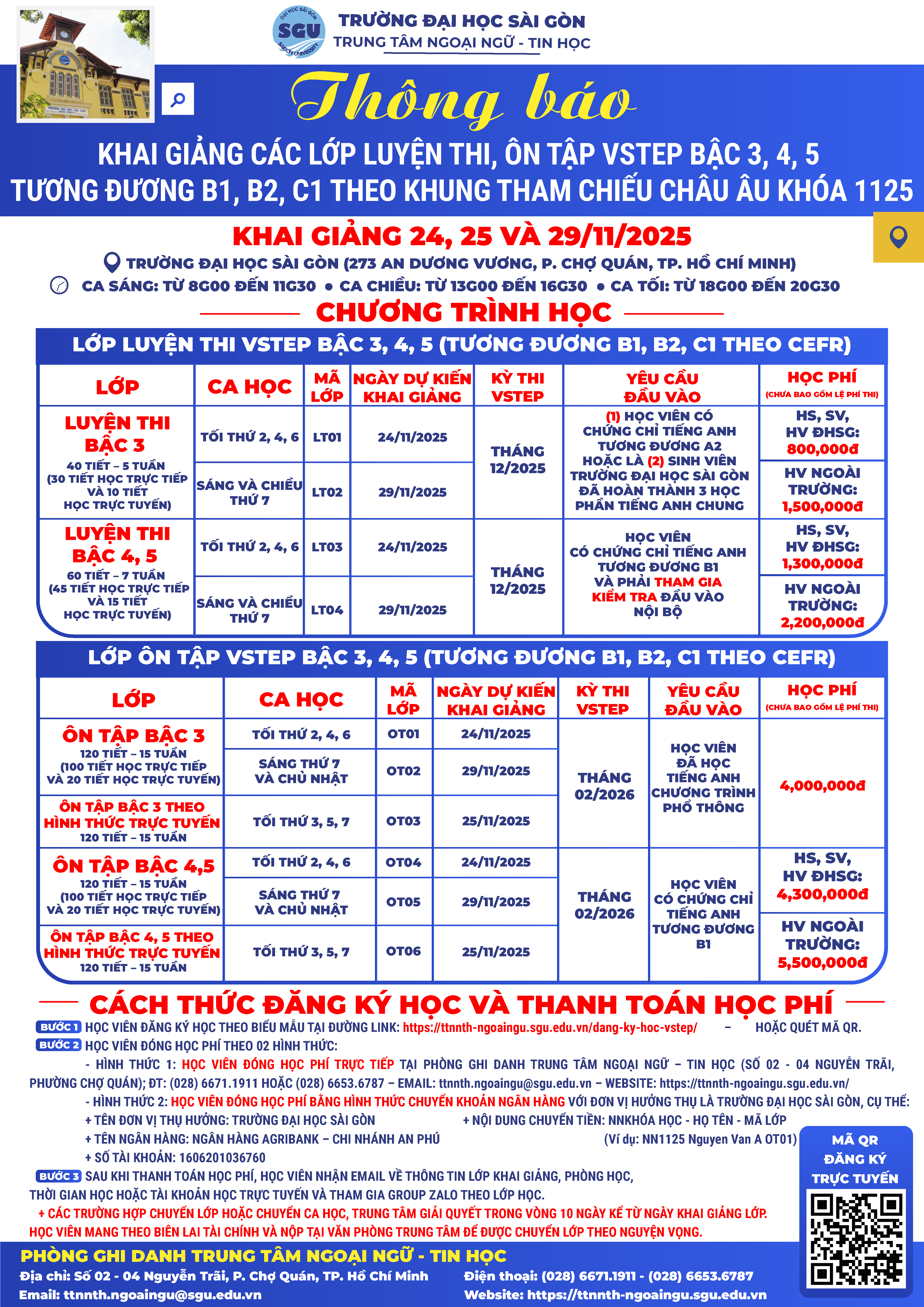Mọi chi tiết xin liên hệ Trung tâm Ngoại ngữ – Tin học: Số 04 Nguyễn Trãi, Phường Chợ Quán, Tp. Hồ Chí Minh. Email: etc@sgu.edu.vn. Điện thoại: 028.66711911