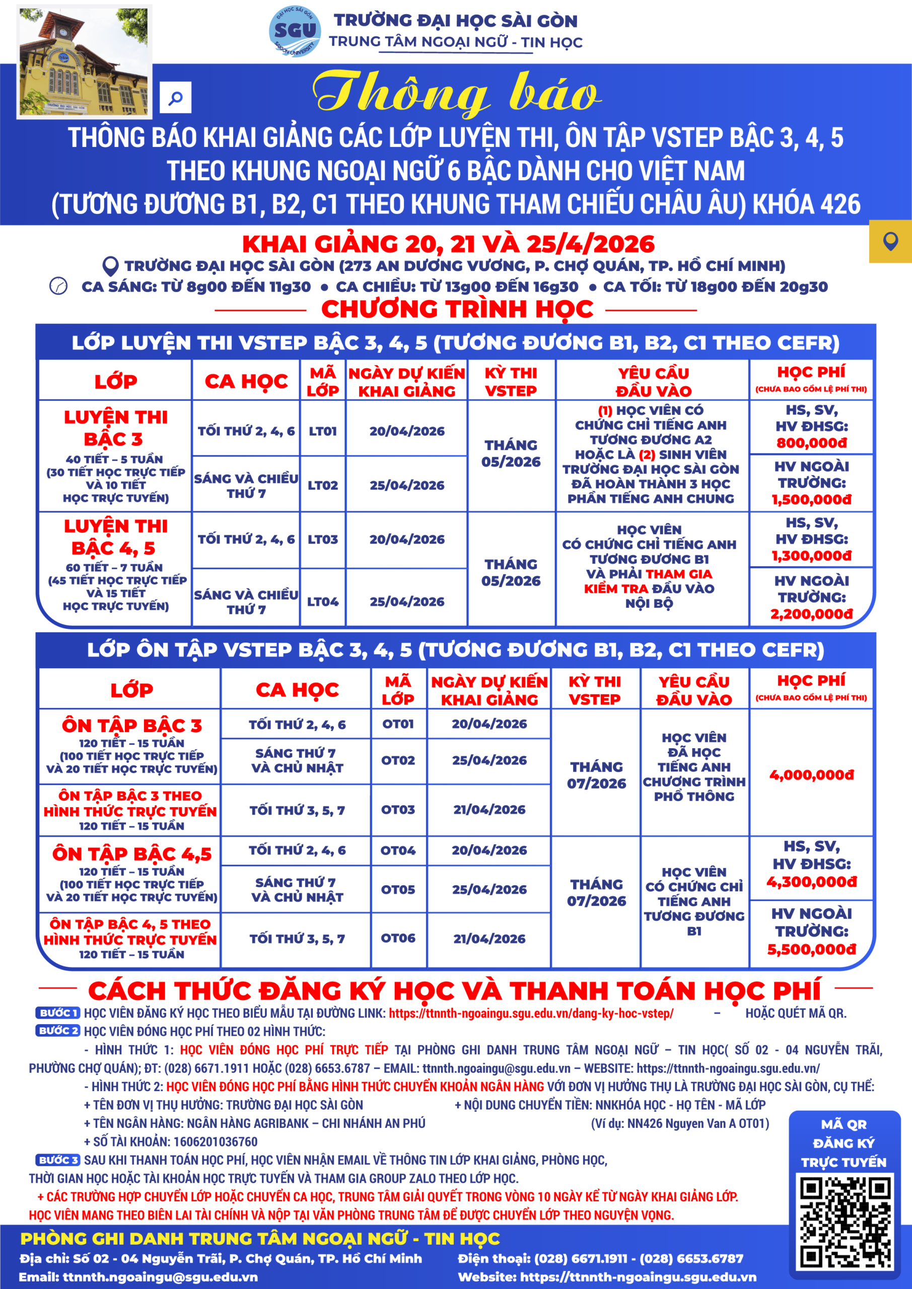 Mọi chi tiết xin liên hệ Trung tâm Ngoại ngữ – Tin học: Số 02 Nguyễn Trãi, Phường Chợ Quán, Tp. Hồ Chí Minh. Email: etc@sgu.edu.vn. Điện thoại: 028.66711911